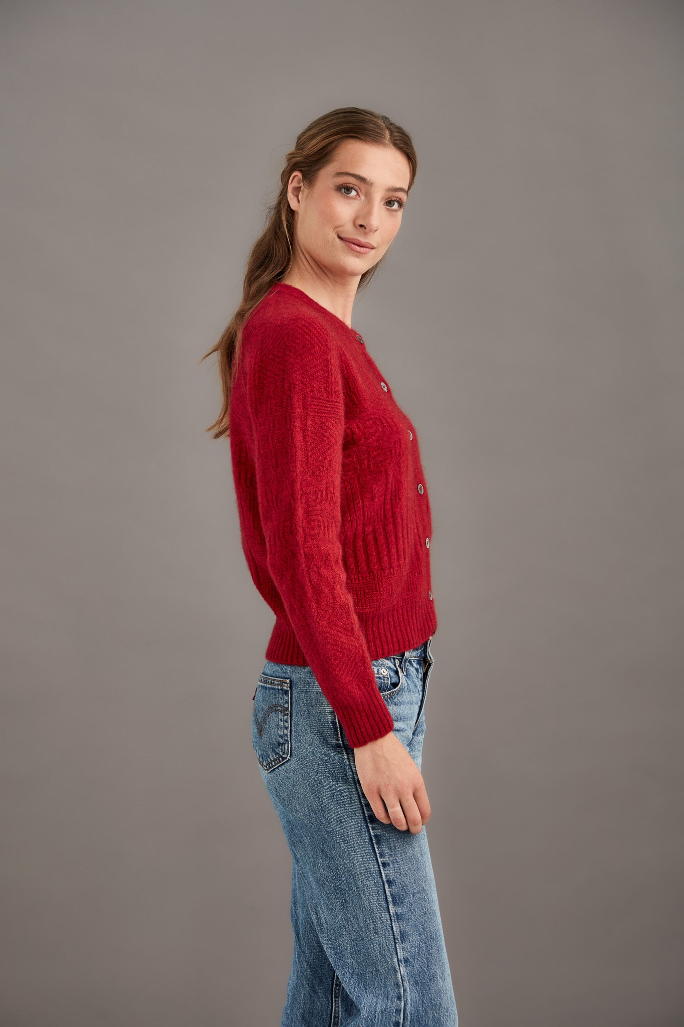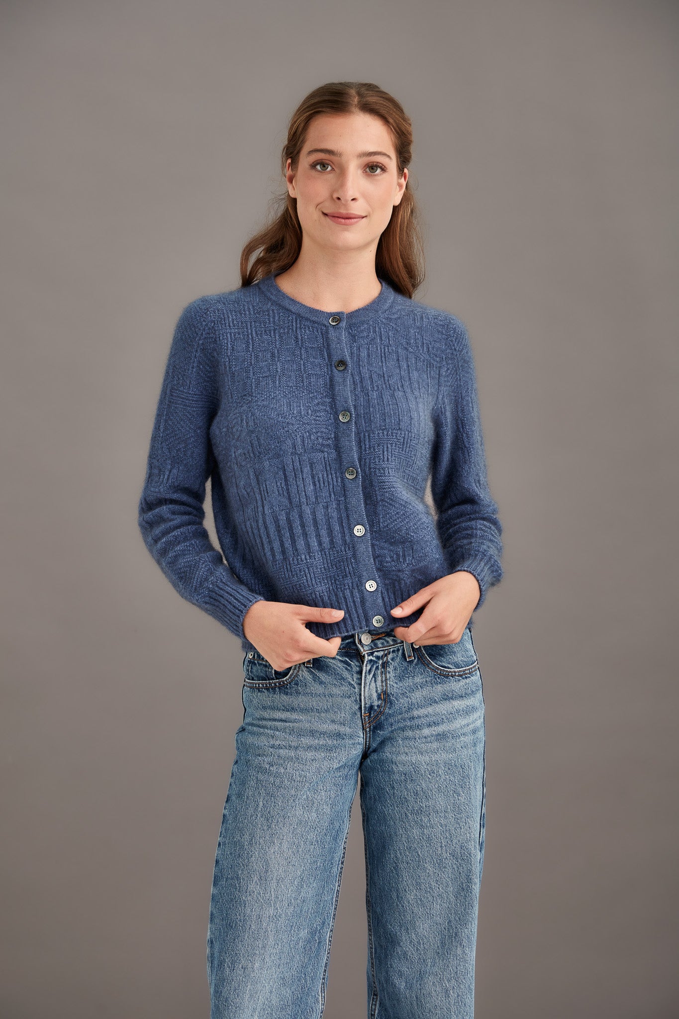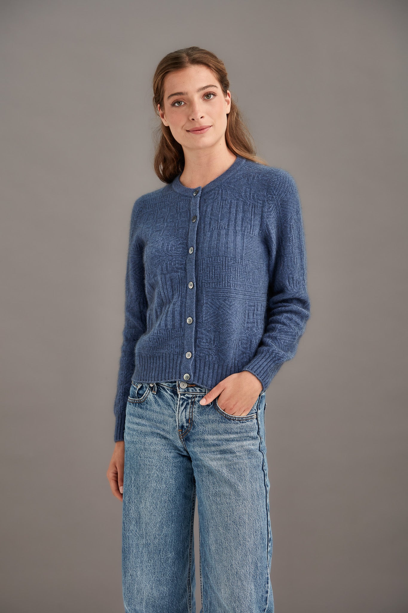 BUTTON PATCHWORK CARDIGAN Button up in this beautifully intricate cardigan featuring details inspired by traditional New Zealand motifs. The luxurious fibres will guarantee warmth and comfort while looking impeccable.